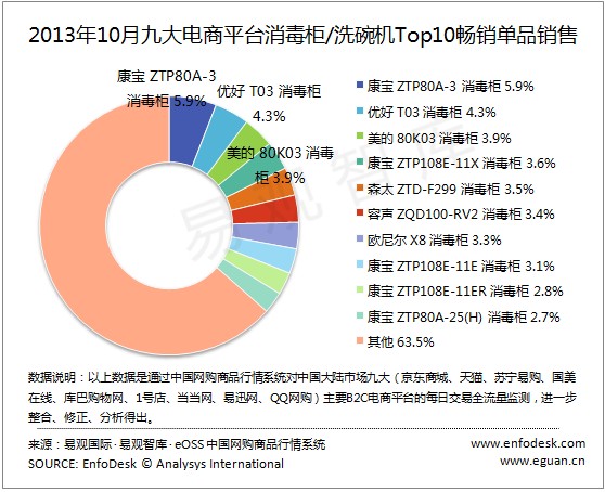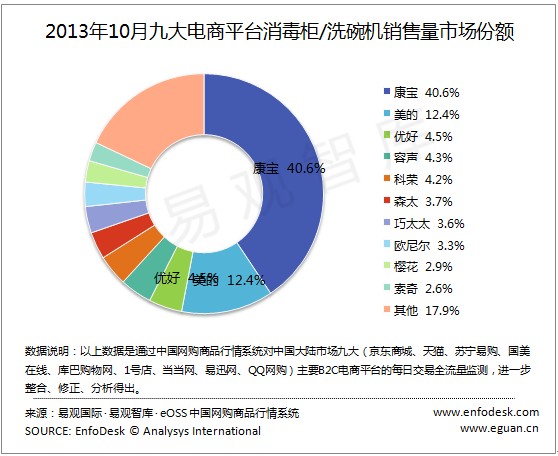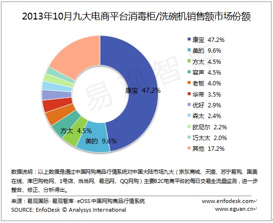 据易观网数据显示,2013年10月九大电商平台消毒柜销售额市场份额品牌排名前三甲是:康宝47.2%,美的9.6%,方太 4.5%;销售量市场份额品牌排名前三甲是:康宝 40.6%,美的 12.4%,优好4.5%。相对销售量份额和相对销售额份额Top10品牌的数量总计13个,总计占整体超8成的市场份额。