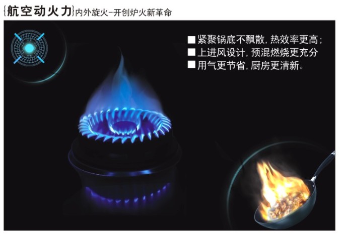 康宝燃气灶创新使用航空动火力,内外旋火-开创炉火新革命,此项技术特点:一、紧聚锅底不飘散,使得热效能更高;二、运用上进风设计,预混燃烧更充分;三、用气更节省,厨房更清新。 第二代康宝燃气灶采用独特的弧形导流设计,更便于溢出的水流入盛液盘,避免引起熄火等意外,改革采用大进风口,使得供氧更充足,燃烧更充分,实现低碳环保。