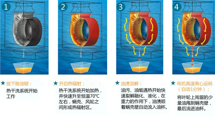 康宝作为消毒柜行业的领导者,在热辐射技术等方面有着多年的成功经验和十分突出的行业地位,康宝独创地把热辐射技术从消毒柜领域引入到烟机上,在烟机内部安装了一种先进的热干洗系统,只需轻按一下烟机的“除油键”,热干洗系统开始快速发热,并快速恒温升至70℃左右,从而在蜗壳、风轮之间形成一个均匀的热辐射区,而凝结的油污、油垢遇热开始快速裂解融化、液化,由于重力的作用,油粒、油渍等顺着蜗壳壁、风轮边缘滴落并自动流入接油盒内。这就做到了不用换一张油网、不拆一个螺钉、更不用一滴水,非常方便。