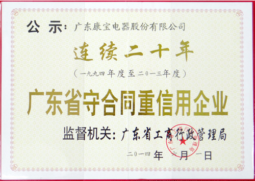 康宝股份连续20年被评为“广东省守合同重信用企业”